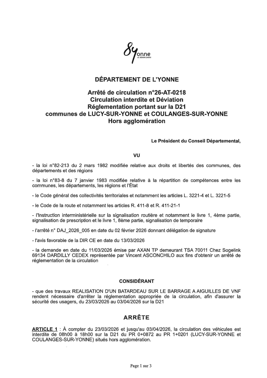 En raison de la reprise des travaux du batardeau sur le barrage à aiguilles de VNF sur la RD21, prévus du jeudi 2 avril au vendredi 3 avril 2026 inclus, le point d’arrêt LUCY /S YONNE – 2 RUE BOURG BASSON ne pourra pas être desservi seulement le soir par le circuit 56 durant cette période.