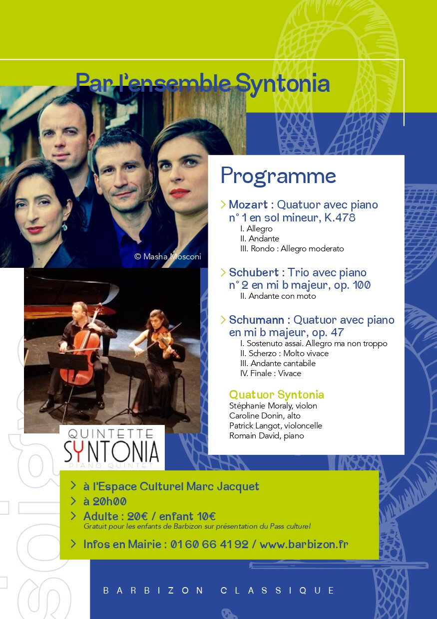 Découvrez une programmation exceptionnelle de concerts à l'Espace Culturel Marc Jacquet avec des artistes d’exception tels que l’Ensemble Syntonia et des programmes autour de Mozart, Schubert, Schumann.