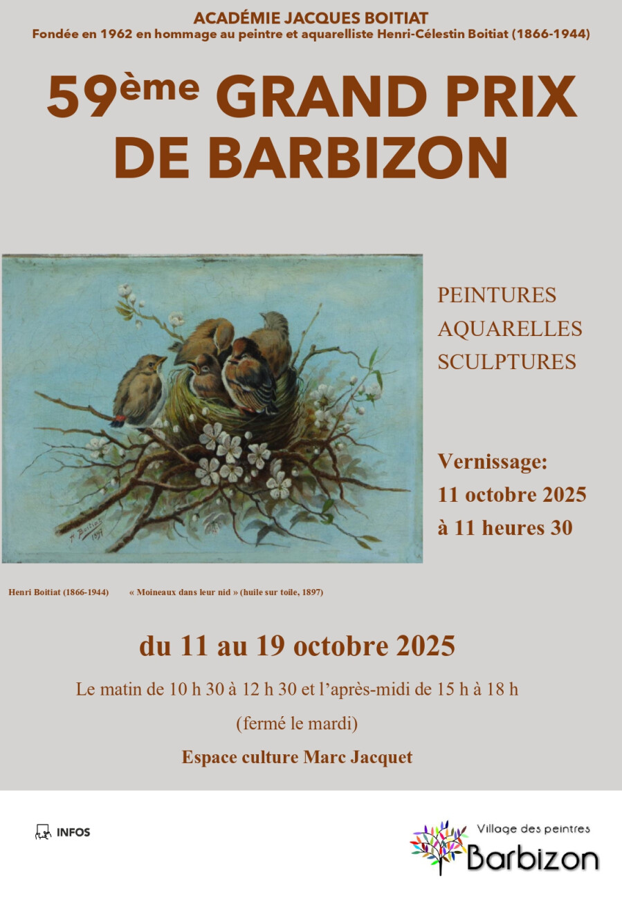 Du 11 au 19 Octobre 2025 à l’espace culturel Marc Jacquet de Barbizon. Venez découvrir les œuvres présentées par des peintres et des sculpteurs de grand talent et qui concourrons pour le 59ième Grand Prix de l’académie Jacques BOITIAT.