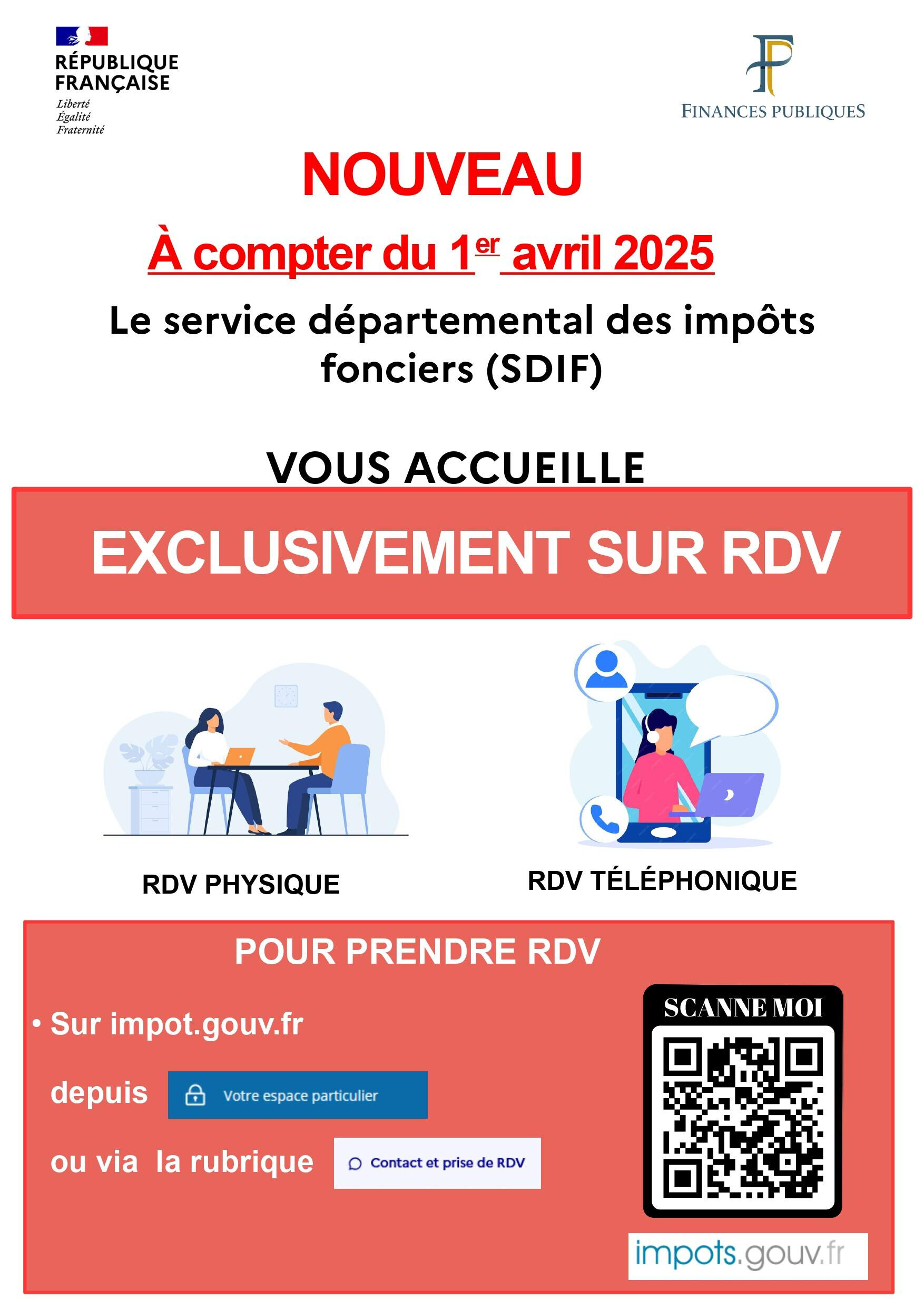 Depuis le 1er avril 2025, le Service Départemental des impôts Fonciers de la Drôme accueille ses usagers exclusivement sur rendez-vous et reste joignable par téléphone et via la messagerie sécurisée.