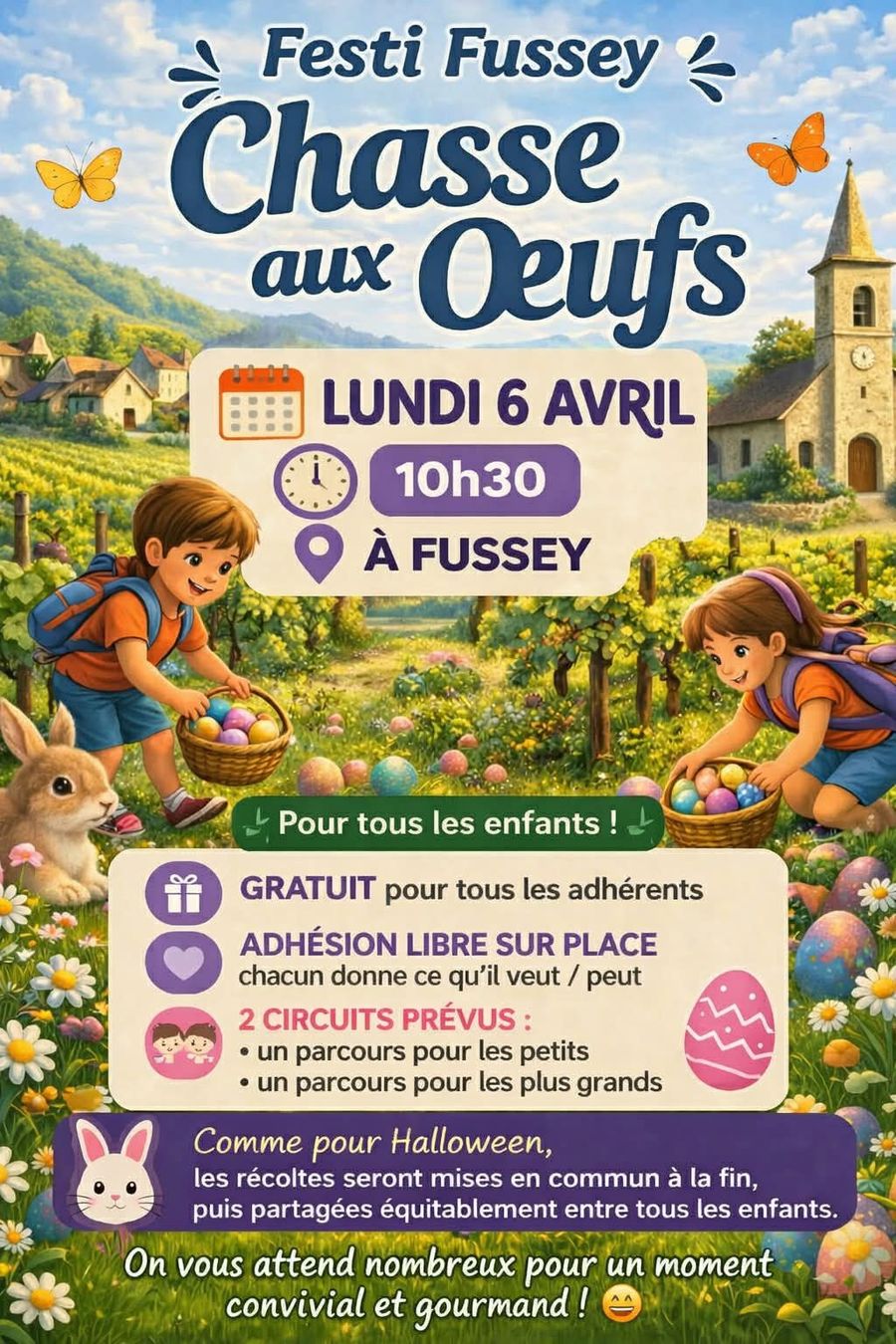 L’association Festi Fussey organise une chasse aux œufs le lundi 6 avril à 10h30 à Fussey, pour tous les enfants du village et des environs.