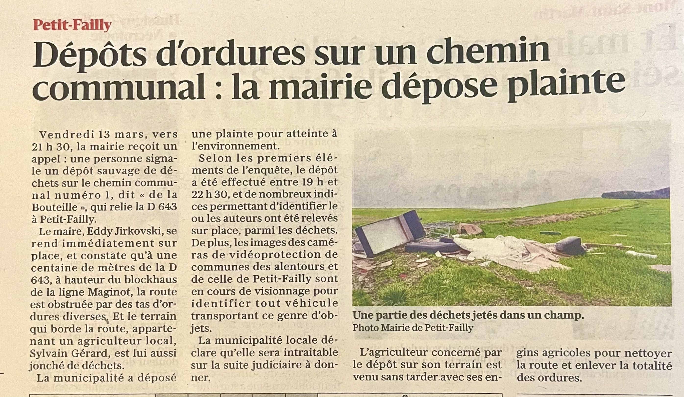 Cette nuit, entre 21h00 et 2h30 ce matin, un nouveau dépÎt sauvage a été constaté rue de la Mairie (dite « la Bouteille »), à proximité de la départementale D643.