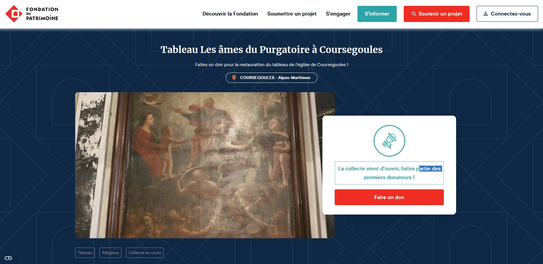 Le tableau des " âmes du Purgatoire" est exposé au sein de l'église Sainte-Marie-Madeleine, située au cœur du village de Coursegoules, dans le haut pays Vençois. Il s'agit d'une huile sur toile de 2,5m X 1,90 m qui date de la fin du XVIIIe - début du XIXe siècle. Avec le temps, cette œuvre a perdu de son éclat. La toile elle-même est détendue ; elle présente des déformations ainsi que des déchirures et se désolidarise du châssis. La couche picturale montre des problèmes de soulèvements, de lacunes dans la polychromie. Ayant souffert de l'usure du temps, ce patrimoine mobilier est aujourd'hui fragilisé et nécessite une restauration urgente.