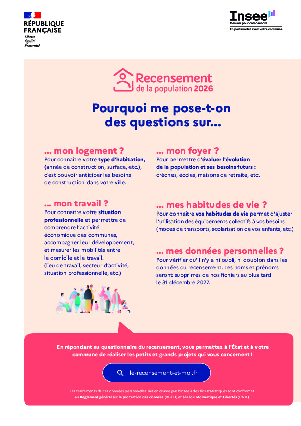 Cette opération, organisée par l'INSEE est obligatoire et concerne l'ensemble des logements et des habitants sur la commune.