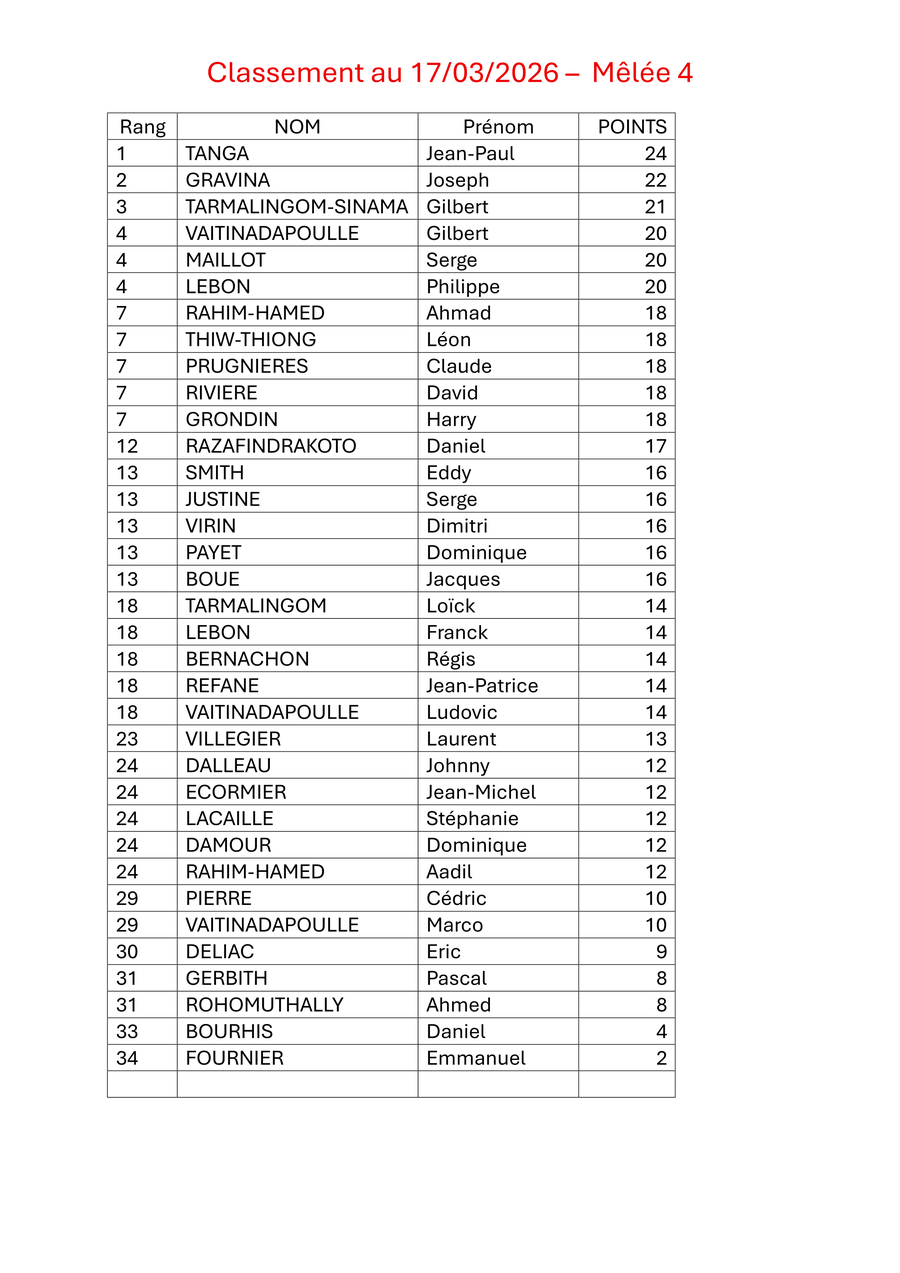 -Samedi 18 avril : Tête à Tête hommes et doublettes dames à Bois de Nèfles, Champ Fleuri et CBSS, St-Philippe, Colosse, Savanna et le Port.