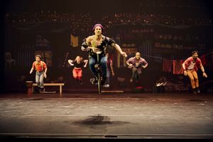 Sangles aériennes, roue Cyr, jonglage, monocycle, trapèze et portés acrobatiques s’enchaînent avec énergie et virtuosité.