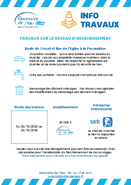 Du 06/10 au 24/10, des travaux seront réalisés sur le réseau d'assainissement route du Crozet et rue de l'Eglise à la Pacaudière.
