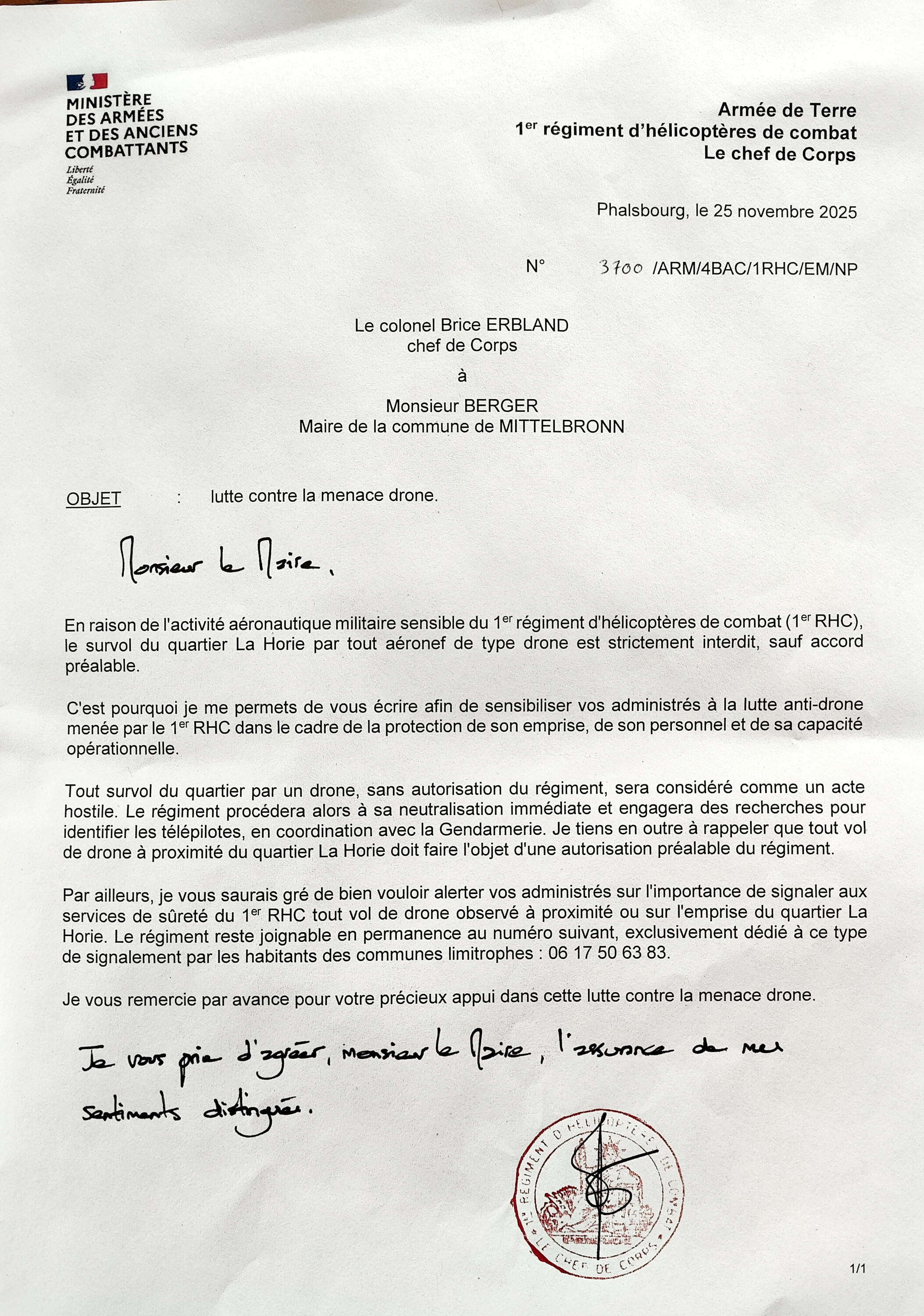 La proximité du Camp La Horie et du 1er Régiment d'Hélicoptères de Combat exige un contrôle strict des vols de drones. Il est aussi nécessaire que la population signale toute présence suspecte dans le ciel.