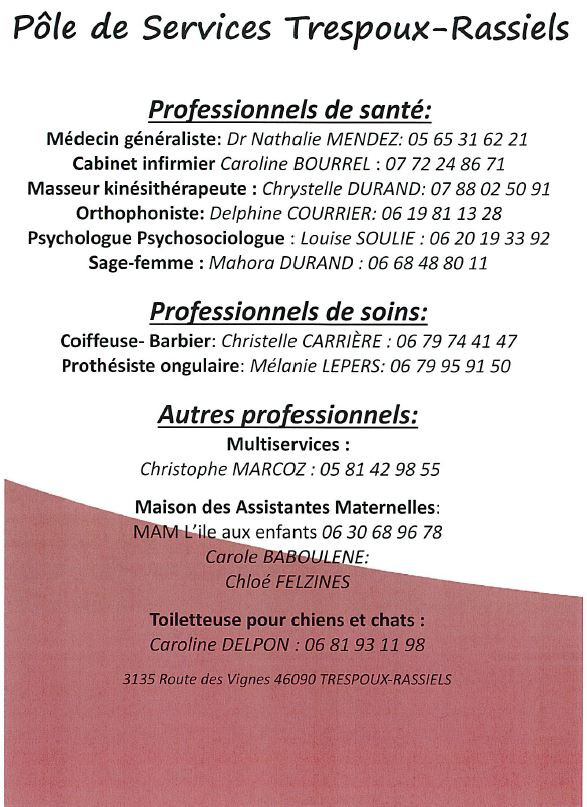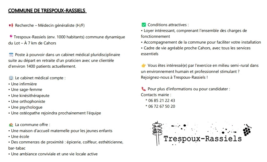 L'offre en matière de santé s'étoffe à la Maison médicale de TRESPOUX-RASSIELS avec l'arrivée d'une Sage-femme libérale Mahora DURAND qui a démarré ses consultations le 1er Septembre 2025.
