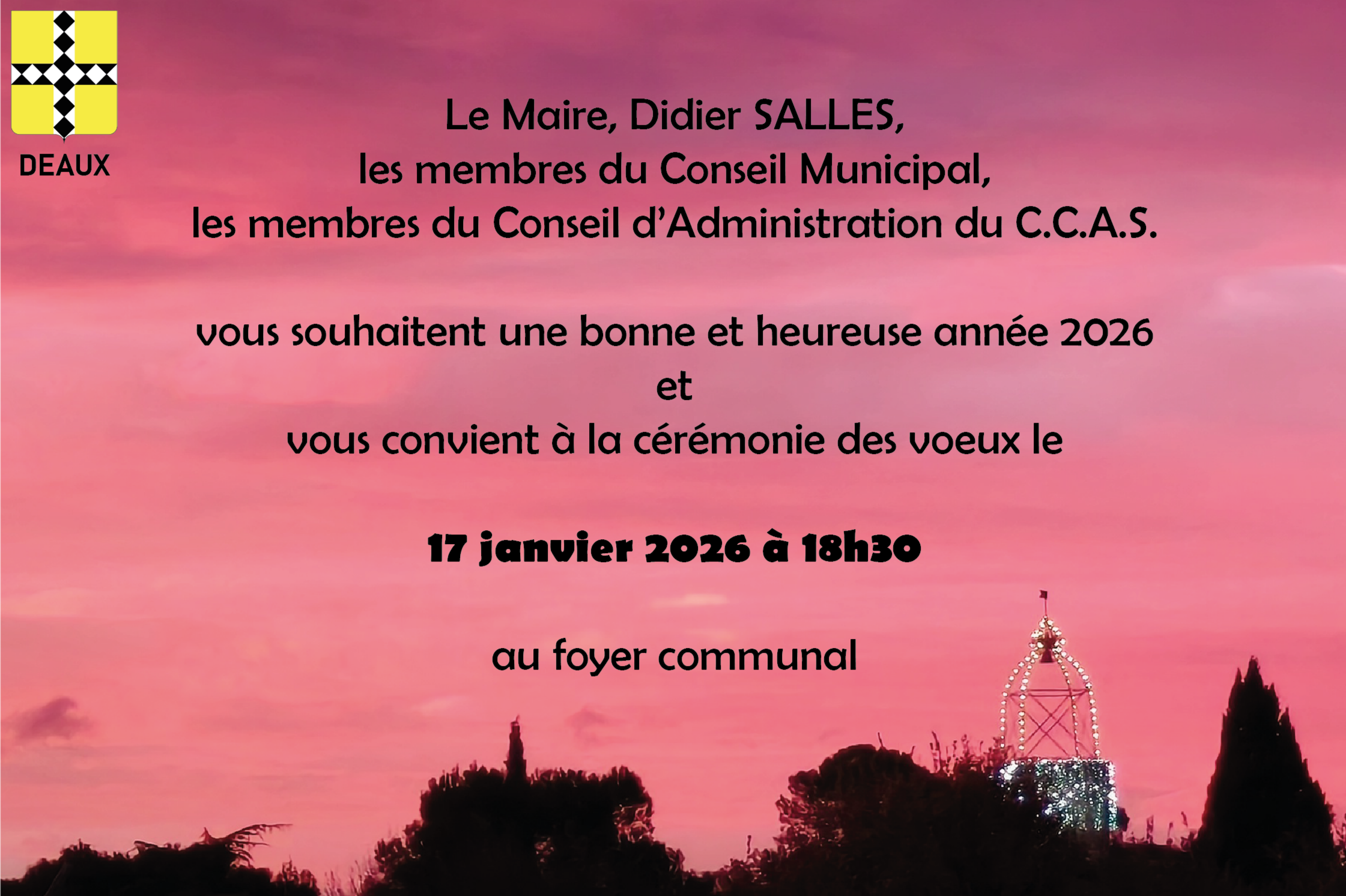 Mr le Maire et l'ensemble de son conseil municipal vous convient à la cérémonie des vœux qui se déroulera au foyer communal le