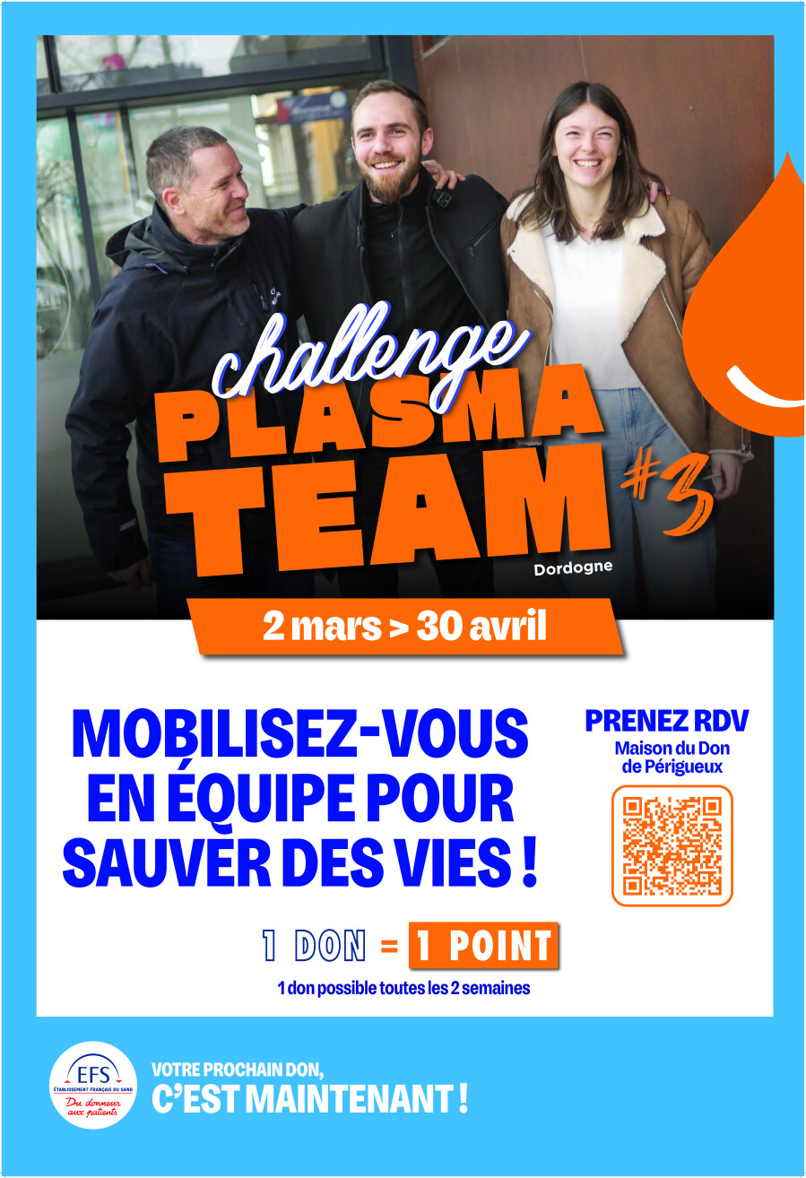 L’Établissement Français du Sang lance sa nouvelle édition du Challenge « PLASMA TEAM » organisé en Dordogne du 02 mars au 30 avril 2026 !
