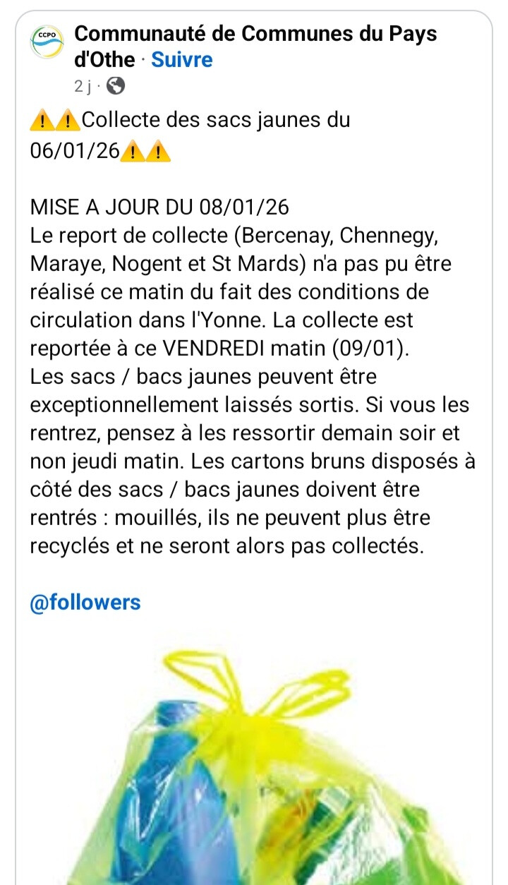 La collecte prévue le 6 janvier est reportée vendredi 9 janvier matin