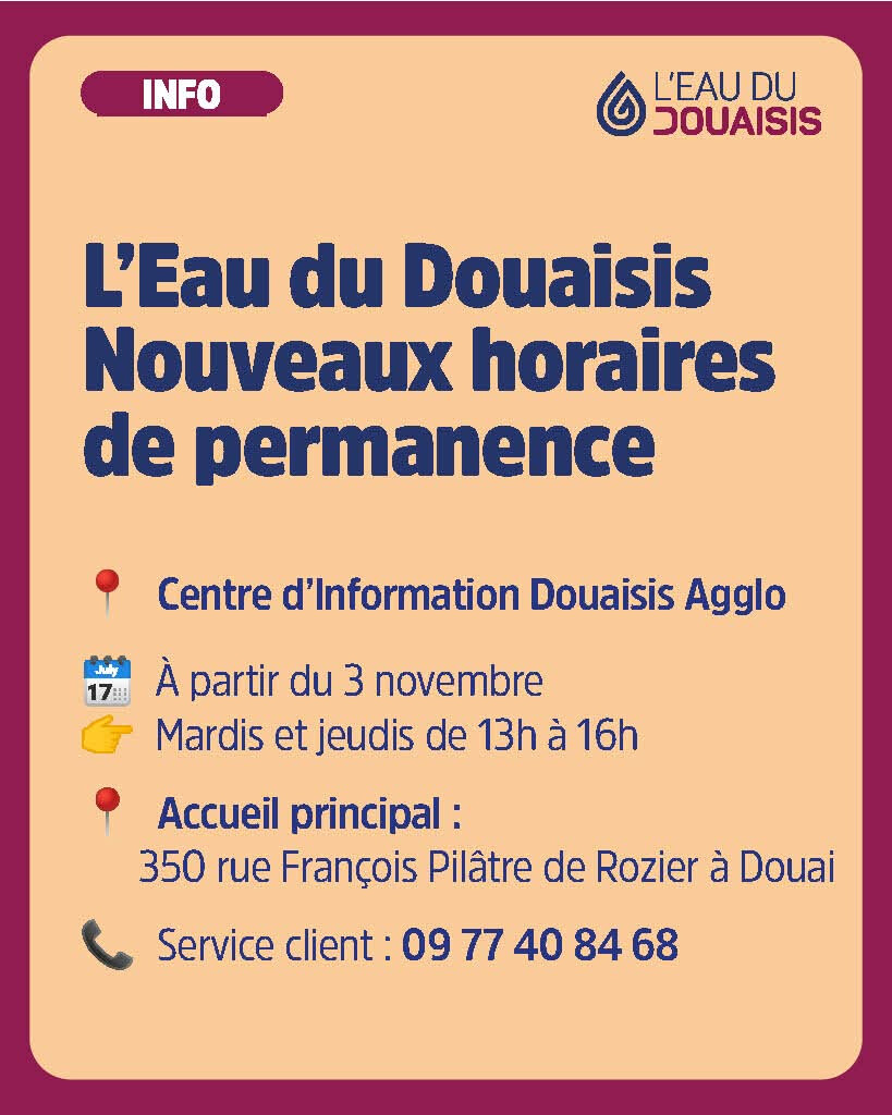 Pour continuer à vous accompagner au plus près, L’Eau du Douaisis adapte la fréquence de ses permanences au 𝗖𝗲𝗻𝘁𝗿𝗲 𝗱’𝗜𝗻𝗳𝗼𝗿𝗺𝗮𝘁𝗶𝗼𝗻 𝗱𝗲 𝗗𝗼𝘂𝗮𝗶𝘀𝗶𝘀 𝗔𝗴𝗴𝗹𝗼.