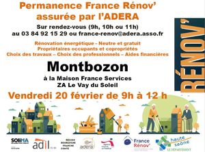 L'Espace Conseil France Rénov' ADERA assurera une permanence sur la Communauté de communes du Pays de Montbozon et du Chanois à Montbozon le vendredi 20 février matin.