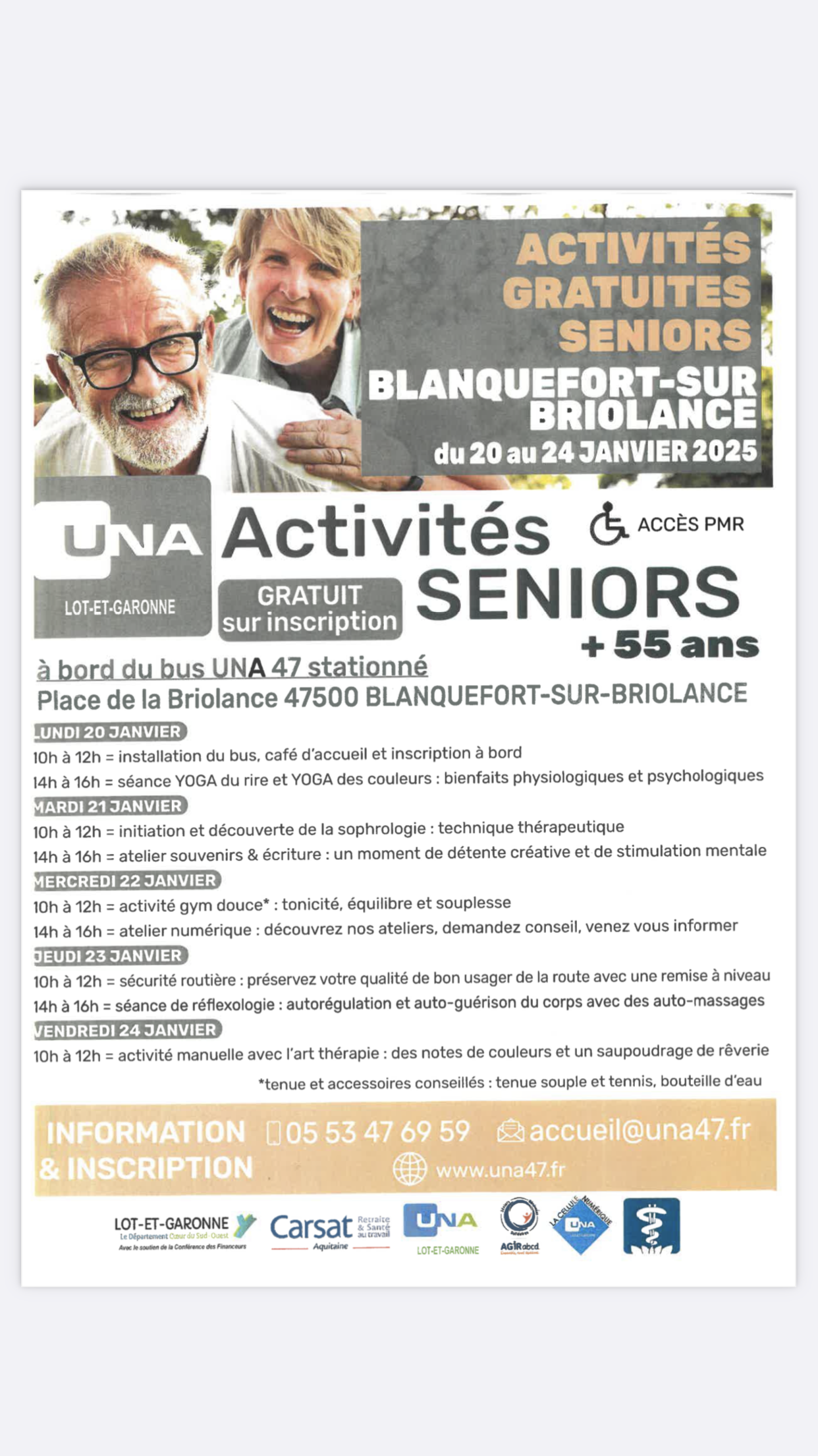 Si vous êtes intéressés, merci de bien vouloir vous inscrire à l'adresse : franceservices@una47.fr ou par téléphone au 07 85 58 08 77. Des ordinateurs seront mis à disposition, cependant France Services conseille d'amener le vôtre.