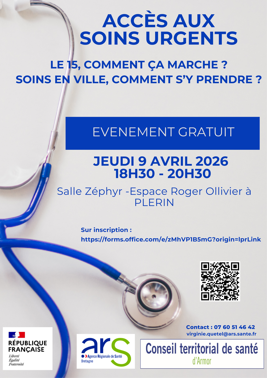 Le Conseil Territorial de Santé d’Armor, en partenariat avec l’Agence Régionale de Santé Bretagne, organise une conférence grand public le 9 avril 2026 à l’Espace Roger Ollivier de Plérin. Cet évènement a pour objectif d’apporter une information claire et accessible sur les parcours de soins urgents et non programmés dans les Côtes d’Armor.