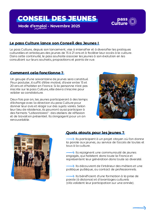 C’est une belle opportunité pour des jeunes que d’être associés à un projet de participation, dans lequel ils pourront exprimer leur point de vue, être écoutés, découvrir de l’intérieur une politique publique nationale. Les membres du Conseil seront accompagnés pour bien comprendre le pass Culture de l’intérieur, et bénéficieront en plus d’une formation à la prise de parole (à distance) et d’avantages culturels (sous forme de chèques cadeaux).