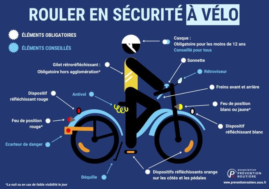 📌 Pour rappel, lorsqu’il fait nuit ou que la visibilité est insuffisante de jour, l'éclairage avant et arrière du vélo devient obligatoire ainsi que le port d'un gilet jaune de haute-visibilité.