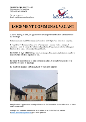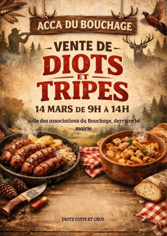 L’Association Communale de Chasse Agréée du Bouchage organise une vente de diots et de tripes le samedi 14 mars, de 9h à 14h, dans la salle des associations (derrière la mairie).