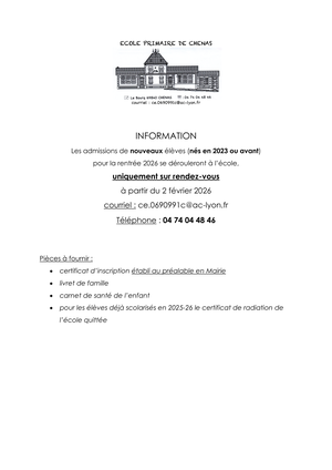 Même si vous n’êtes pas directement concernés, merci de diffuser ces éléments à toute personne de votre connaissance susceptible de vouloir scolariser son/ses enfants à l’école de CHENAS. Toute demande de dérogation pourra être étudiée par la Mairie.