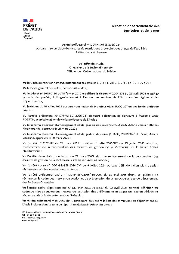 Arrêté préfectoral n° DDTM-SAFEB-2025-024 du 6 novembre 2025 portant mise en place de mesures de restrictions provisoires des usages de l'eau liées à l'état de la sécheresse.
