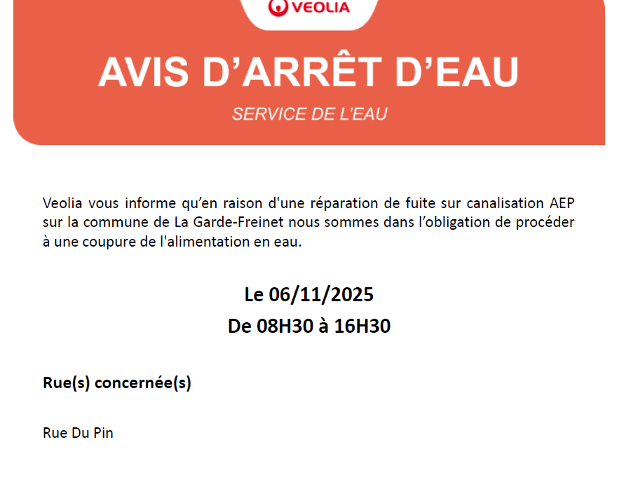 Coupure d'eau rue du Pin est reportée à jeudi 6 novembre 2025 - de 8h30 à 16h30.