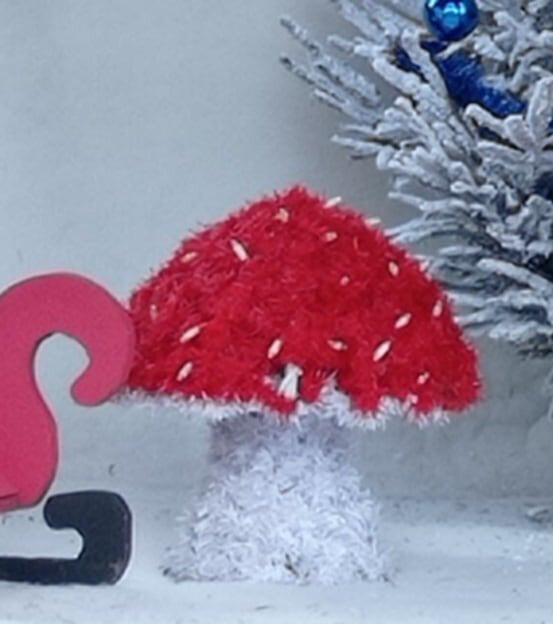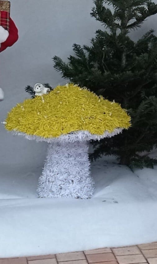 2 jolis bolets, l’un jaune et l’autre rouge à pois blancs, éléments de la déco de Noël de la commune installés près de l’école primaire, ont disparu ! 😱 😡