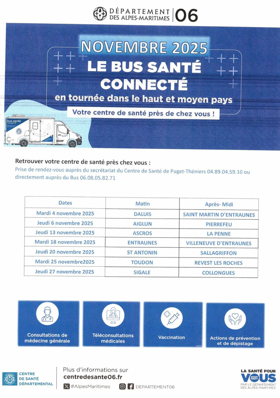 Le Bus Santé Connecté, une initiative innovante pour rapprocher la médecine de chez vous, sera présent à Collongues. Ce service itinérant propose :