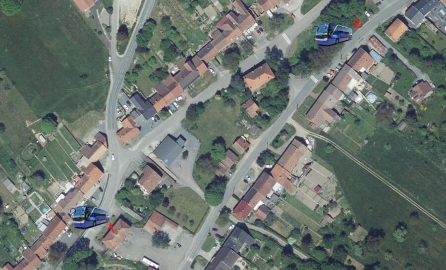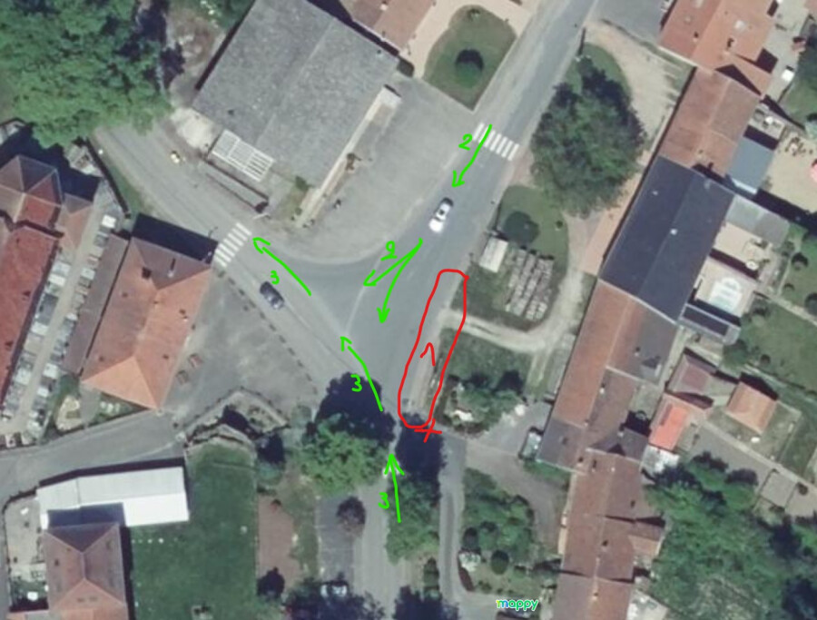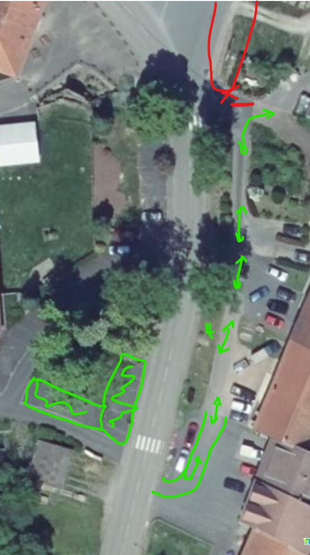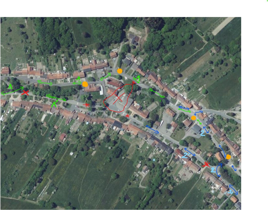 Un feu alterné (points orange) sera mis en place avant la salle des fêtes et près du monument aux morts afin de sécuriser le passage devant l’église et la salle des fêtes.