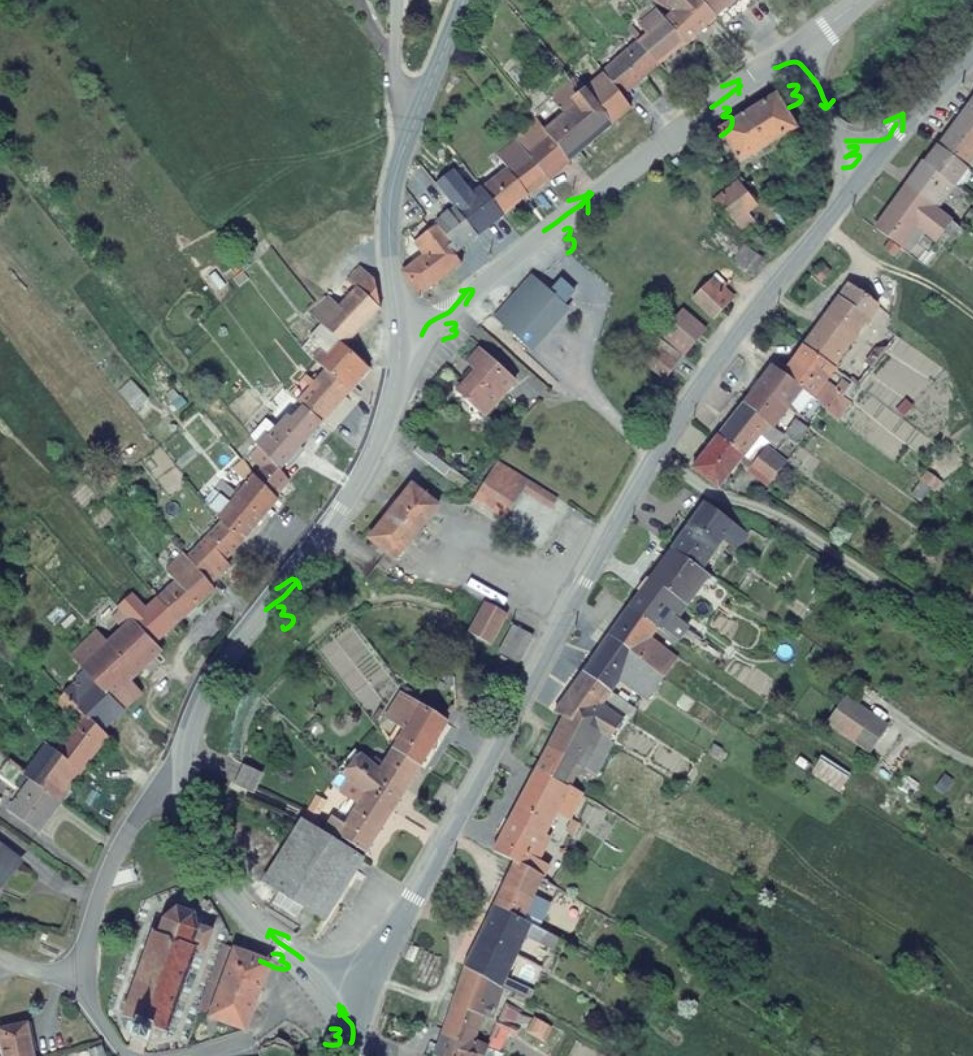 1- Rue du Rehtal, les voitures venant de Guntzviller circulant dans le sens Saint-Louis/Hommarting et inversement, emprunteront la rue de l’église tracé vert (1)