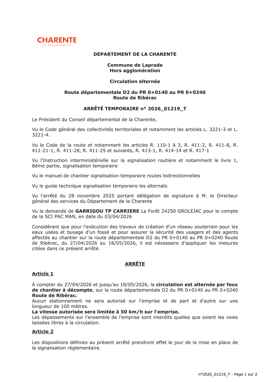 Le Département de la Charente a retenu au titre de son programme de travaux 2026 l'aménagement du carrefour entre les routes départementales 10 et 2 sur le territoire de la commune d'Aubeterre-sur-Dronne.