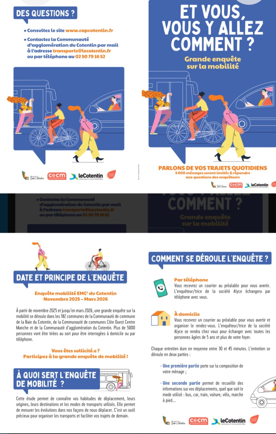 Dans le cadre de la grande enquête mobilité du Cotentin plus de 5000 ménages de l'Agglomération du Cotentin et des Communautés de communes de Baie du Cotentin et de Côte Ouest Centre Manche seront enquêtés entre novembre 2025 et mars 2026.