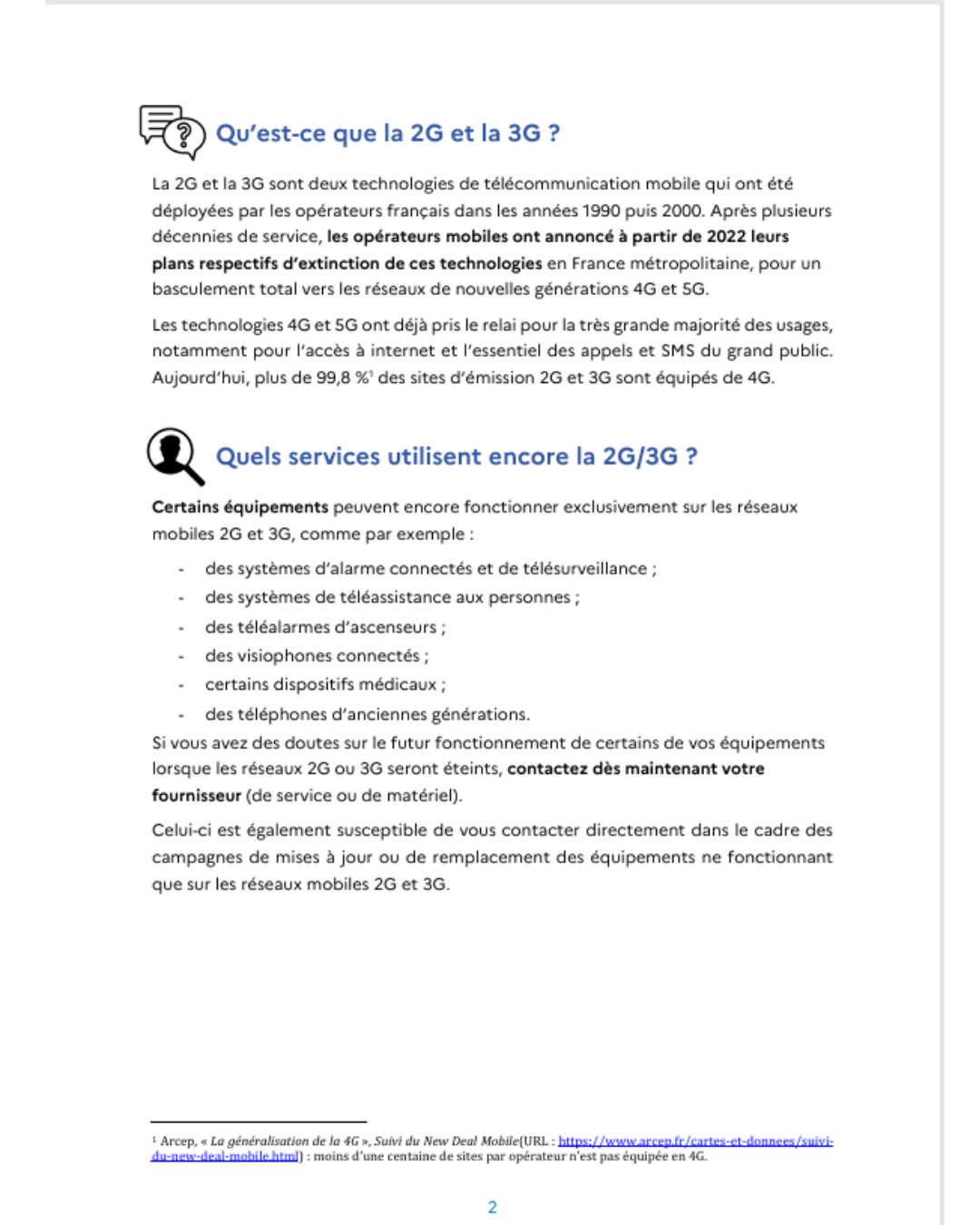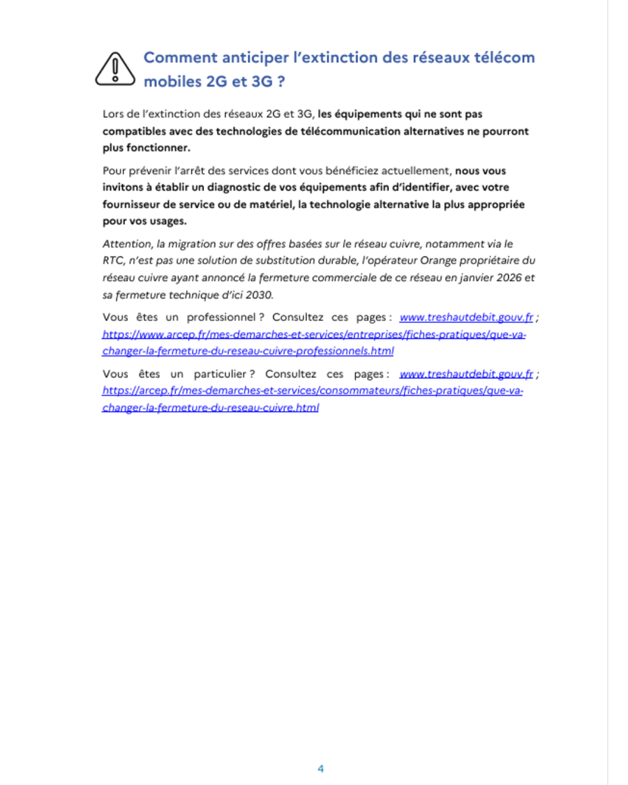 👉 Cela concerne aussi certains objets connectés (téléalarmes, alarmes, téléassistance, etc.) qui devront être remplacés ou mis à jour pour fonctionner sur des réseaux plus récents.