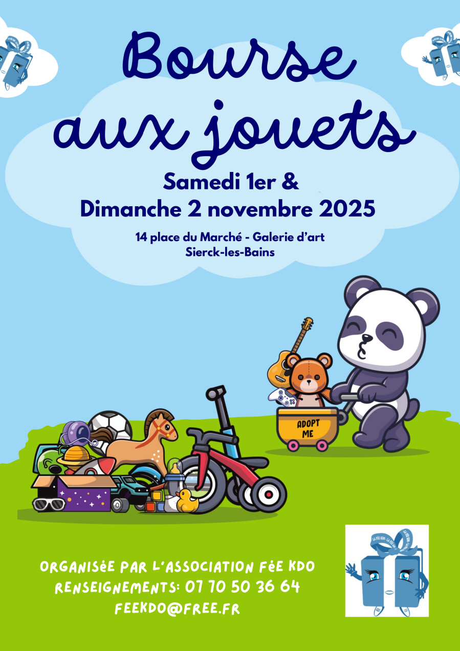 🧸L'association Fée Kdo organise une bourse aux jouets samedi 1er et dimanche 2 novembre (de 10h à 18h) à l'ancienne galerie d'art, 14 place du Marché à Sierck-les-Bains.