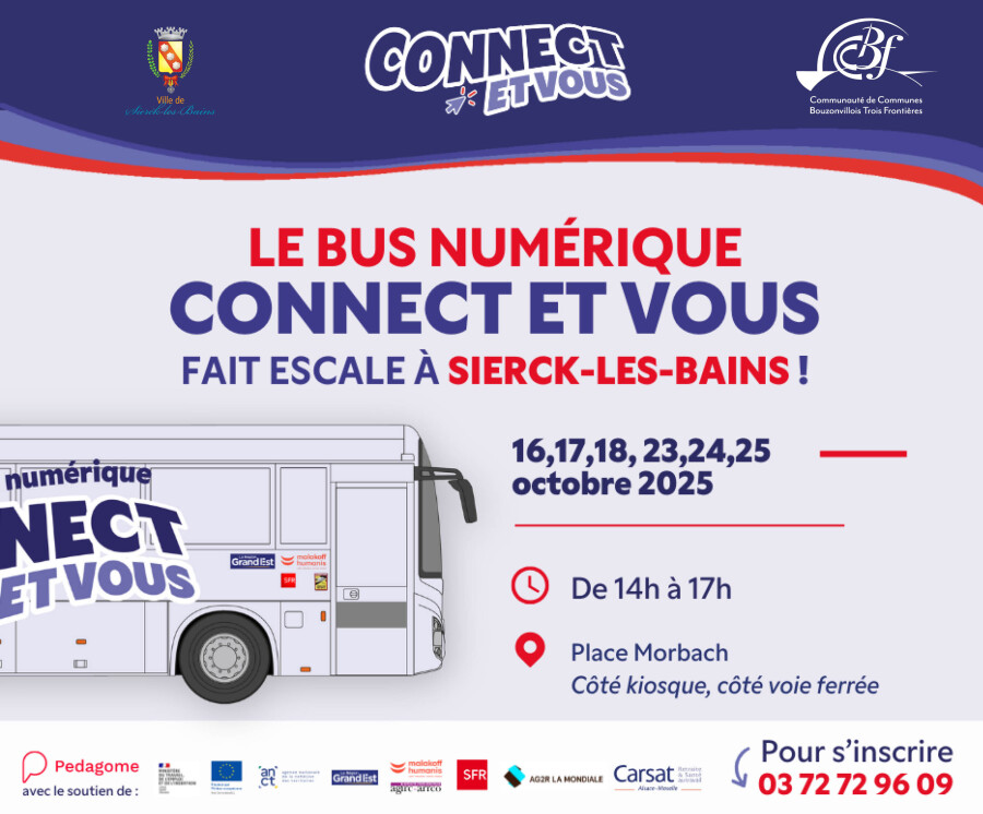 🚌La CCB3F accueille le dispositif Connect et vous de Pedagome sur son territoire (à Bouzonville, Flastroff et Sierck-les-Bains). Il sera présent sur notre commune les 16, 17, 18, 23, 24 et 25 octobre de 14h00 à 17h00 au parking place Morbach (côté kiosque).