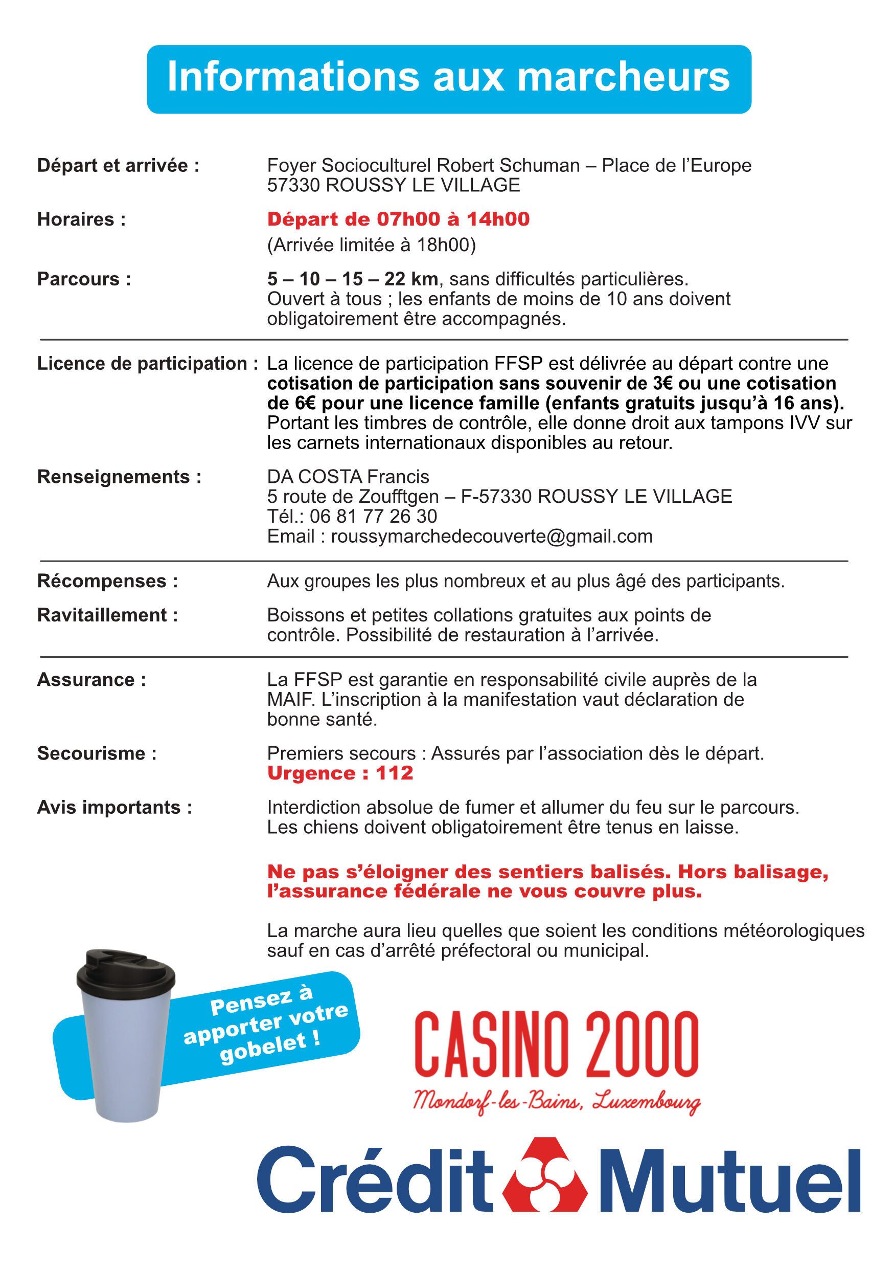 - Départ dès 7h depuis la place de l'Europe de Roussy (parking de l'école)