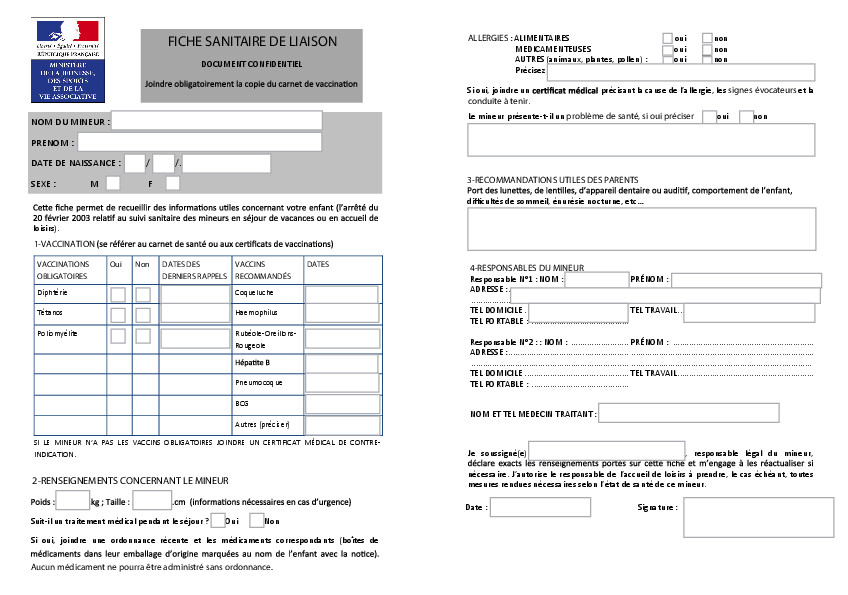 Vous trouverez également la fiche sanitaire de liaison ainsi que le règlement intérieur. Ces documents peuvent être complétés sur votre ordinateur ou téléphone portable. Vous pouvez également les imprimer et les compléter ou les retirer en mairie.