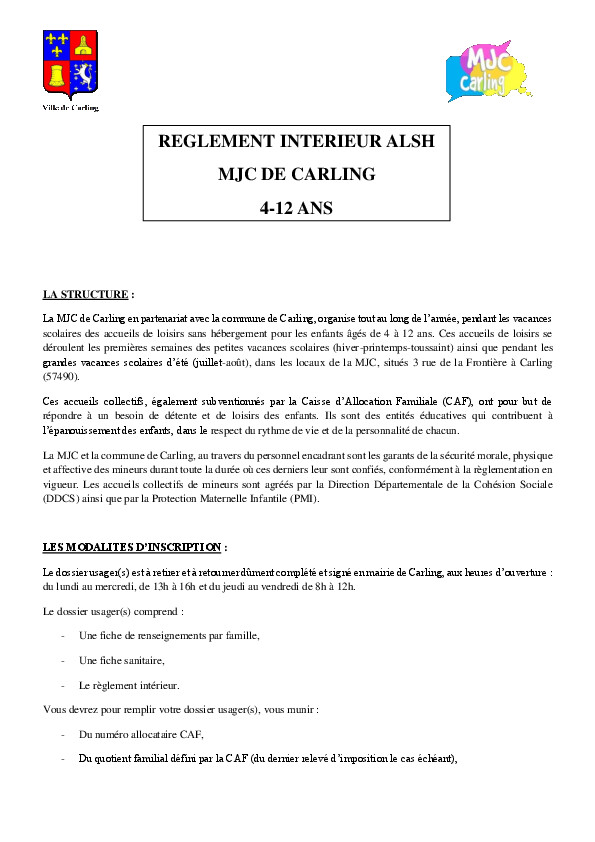 Les dossiers complets (dossier usager + fiche sanitaire de liaison + vaccinations + règlement intérieur) sont à retourner le plus rapidement possible, soit par mail à l'adresse suivante jeunesse@carling.fr soit en les déposant à la mairie.