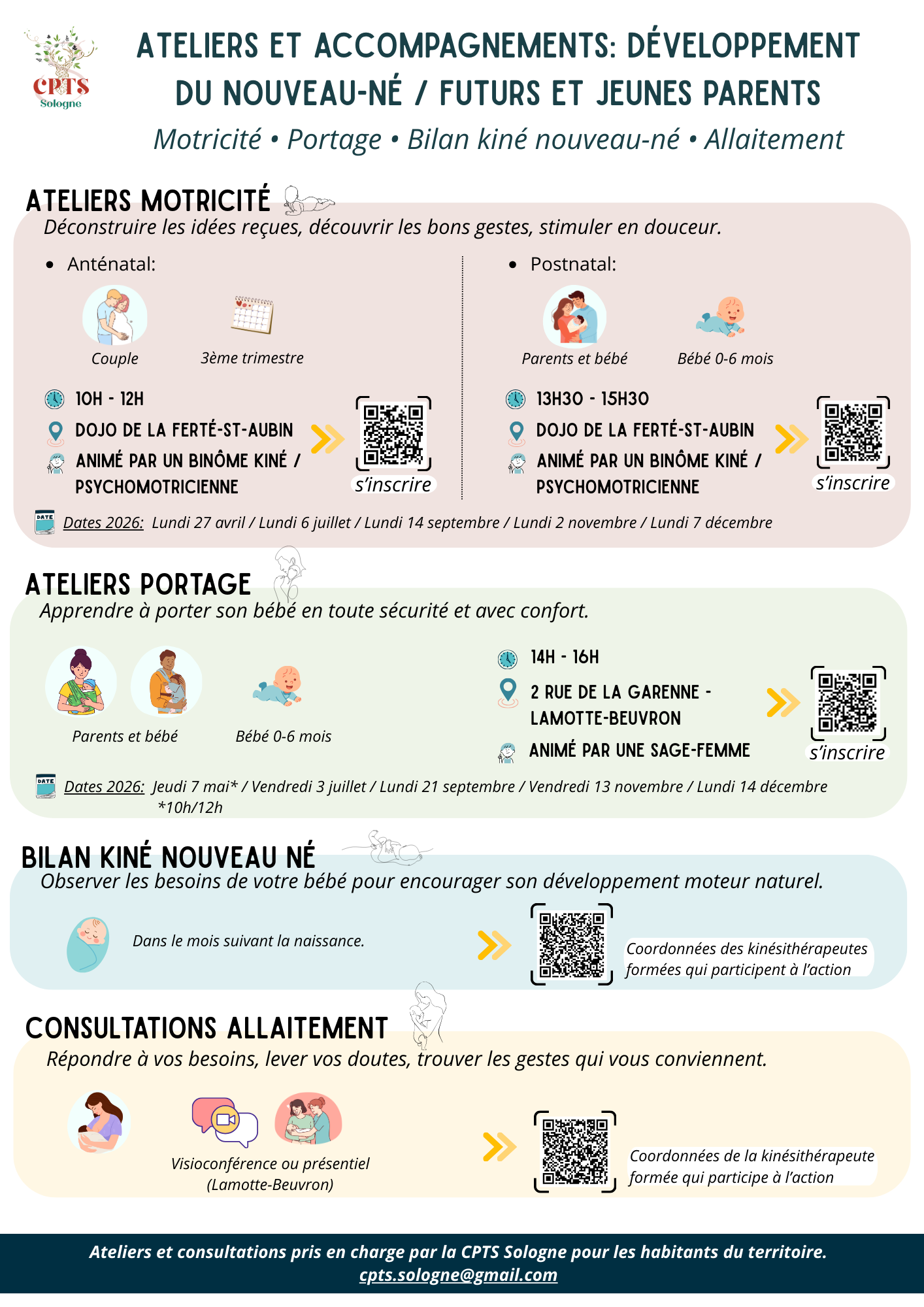 propose des actions et des ateliers à destination des futurs et jeunes parents (ateliers motricité, portage, bilan kiné du nouveau-né et consultations allaitement).