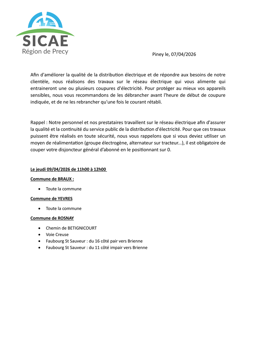 La SICAE informe ses abonnés, qu'en raison de travaux sur le réseau, le courant sera coupé :