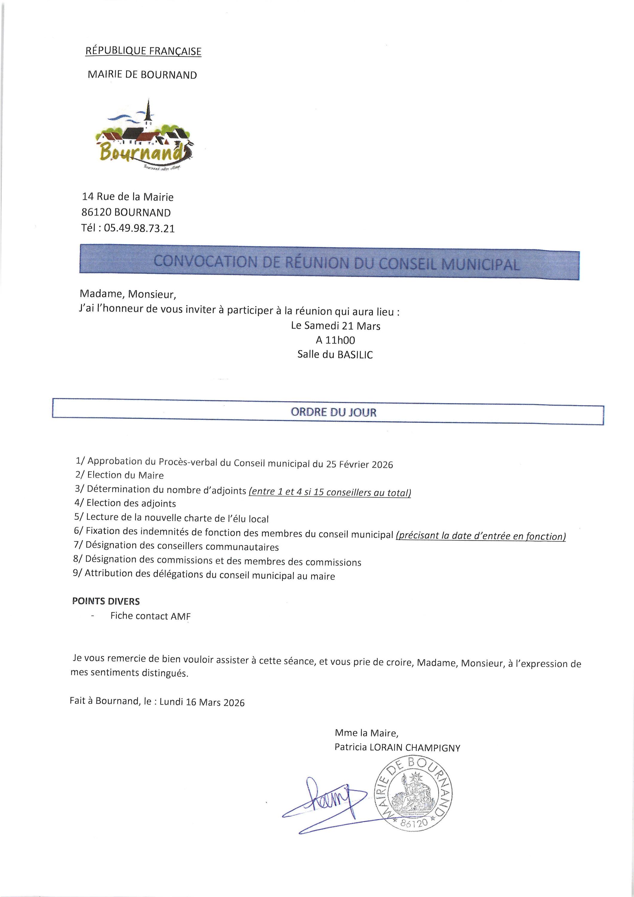 Nous vous informons que le nouveau conseil municipal se réunira le Samedi 21 mars à 11 h
