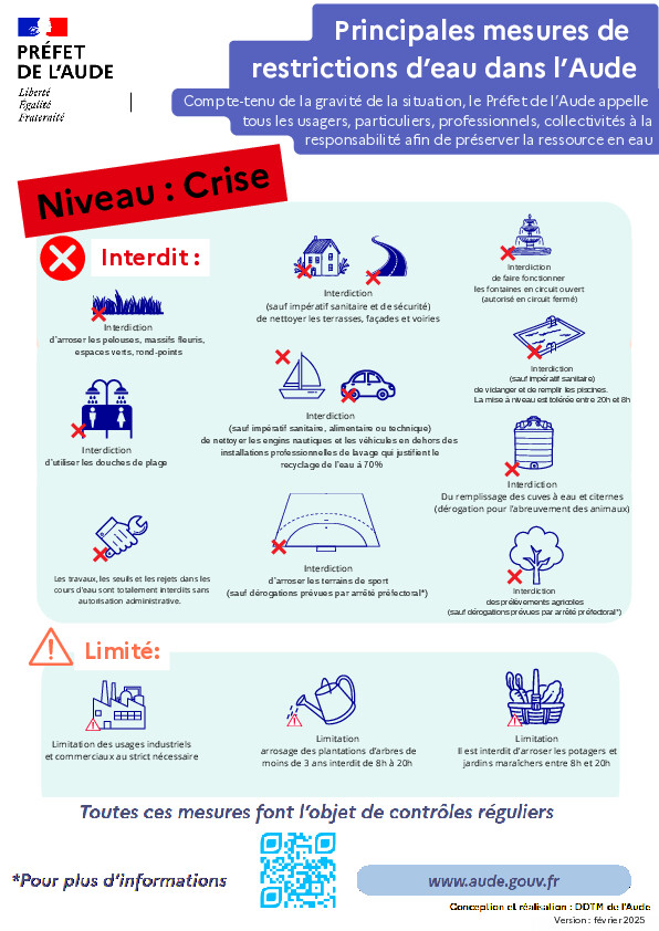Compte tenu de l'état de sécheresse, le Préfet de l'Aude vient de publier un nouvel arrêté portant restrictions des usages de l'eau
