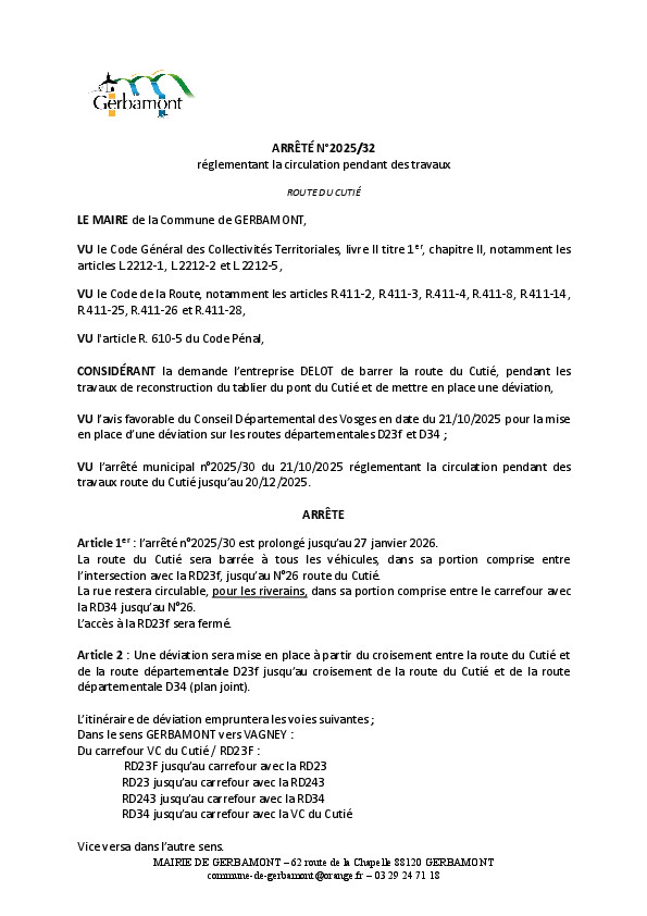 En raison des modifications engagées par l’entreprise DELOT suite au démontage du vieux pont route du Cutié à GERBAMONT et aux travaux supplémentaires, la fermeture de la route du Cutié et la déviation mise en place par la commune de Vagney sont prolongées jusqu’au 27 janvier 2026