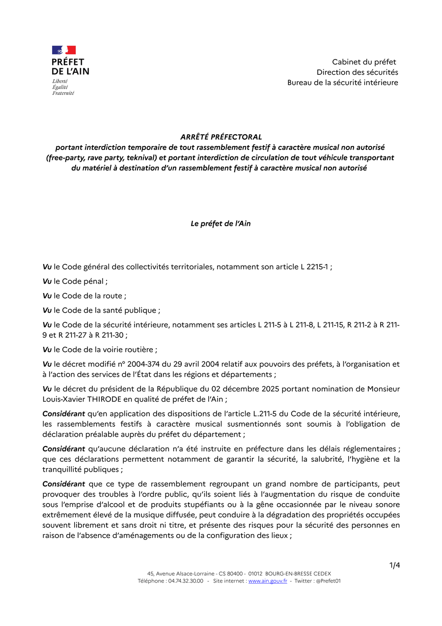 portant interdiction temporaire de tout rassemblement festif à caractère musical non autorisé (rave party, free party) et portant interdiction de circulation de tout véhicule transportant du matériel à destination d'un rassemblement festif à caractère musical non autorisé sur les périodes suivantes :