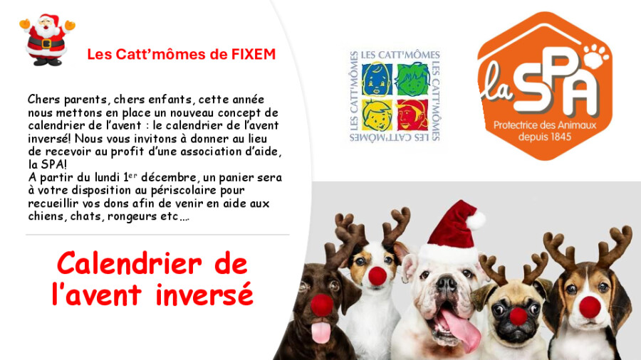 Chers parents, chers enfants, cette année nous mettons en place un nouveau concept de calendrier de l’avent : le calendrier de l’avent inversé! Nous vous invitons à donner au lieu de recevoir au profit d’une association d’aide, la SPA!A partir du lundi 1erdécembre, un panier sera à votre disposition au périscolaire pour recueillir vos dons afin de venir en aide aux chiens, chats, rongeurs etc….