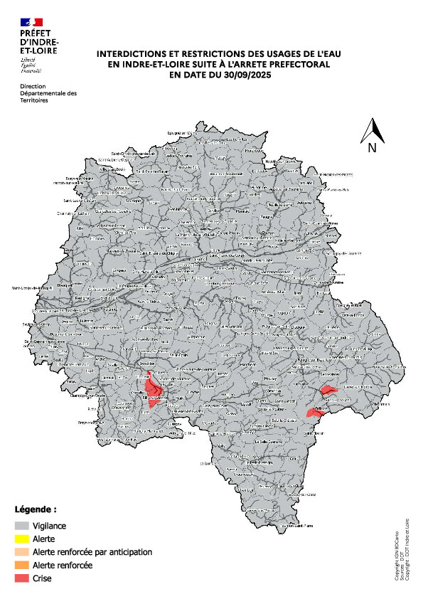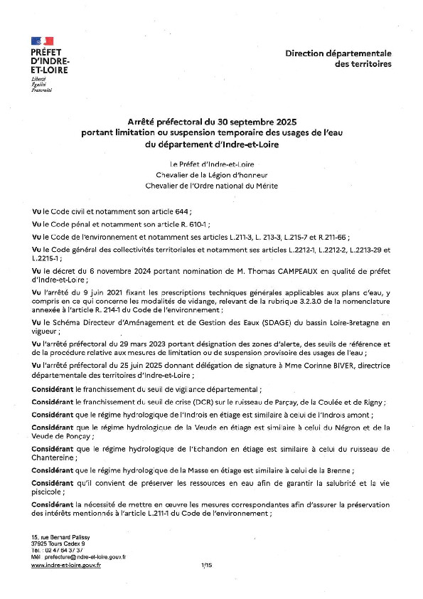 Ci-dessous l'arrêté préfectoral du du 30 septembre 2025 portant limitation ou suspension temporaire des usages de l'eau en Indre-et-Loire.
