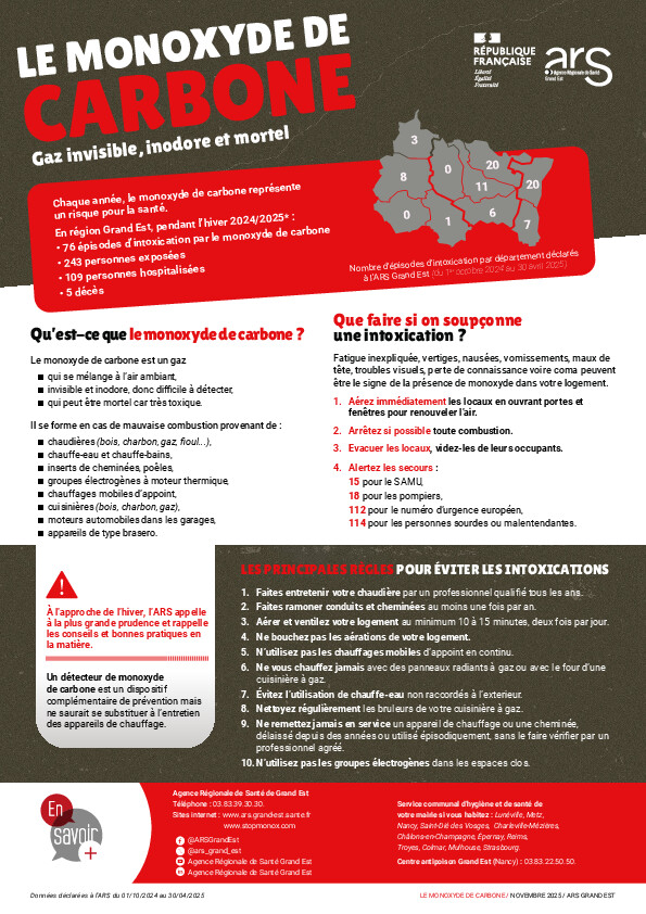 À l’approche de l’hiver, l’ARS Grand Est appelle donc à la plus grande prudence et rappelle les conseils de prévention et bonnes pratiques pour s’en prémunir : pendant l’hiver 2024-2025, 76 épisodes d’intoxication au monoxyde de carbone ont été recensés dans notre région, exposant 243 personnes à ce gaz. 109 personnes ont dû être hospitalisées et 5 décès sont à déplorer.