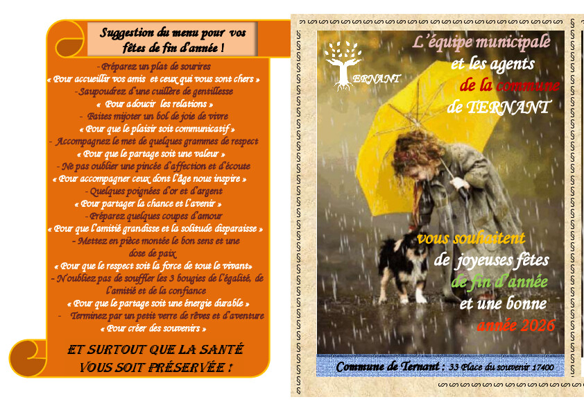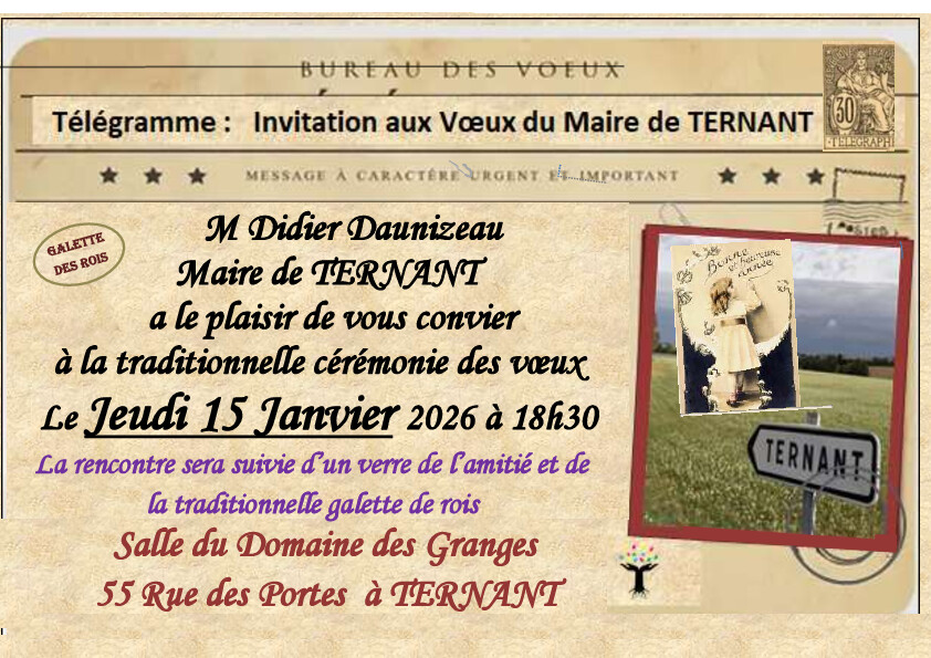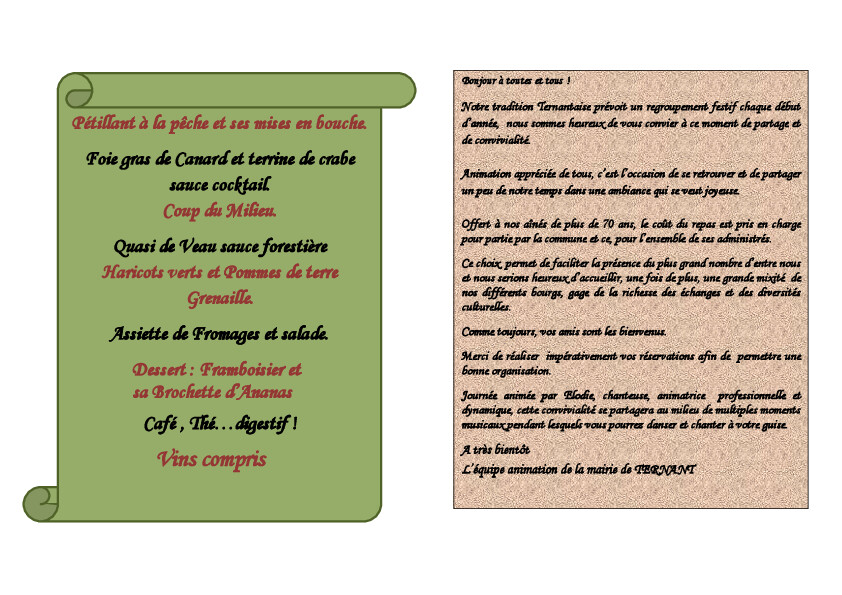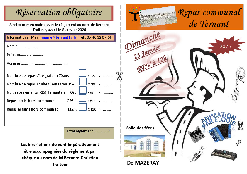 La commune de Ternant vous invite à son repas annuel qui se déroulera le 25 Janvier 2026 salle des fêtes de Mazeray