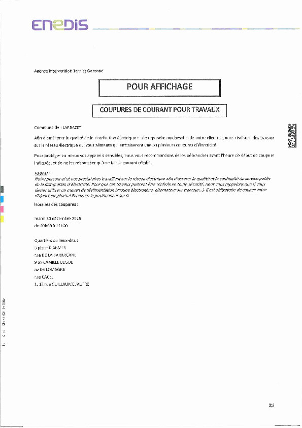 Pour répondre aux besoins de sa clientèle, Enedis a prévu de réaliser sur le réseau de distribution des travaux qui entraîneront une ou plusieurs coupures d’électricité.