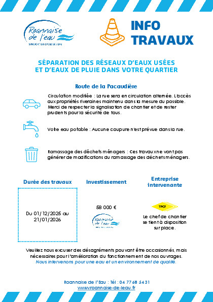 Du 01/12 au 21/01, des travaux sur les réseaux d'eaux usées et pluviales seront réalisés Route de la PacaudiÚre à Sail-les-Bains.